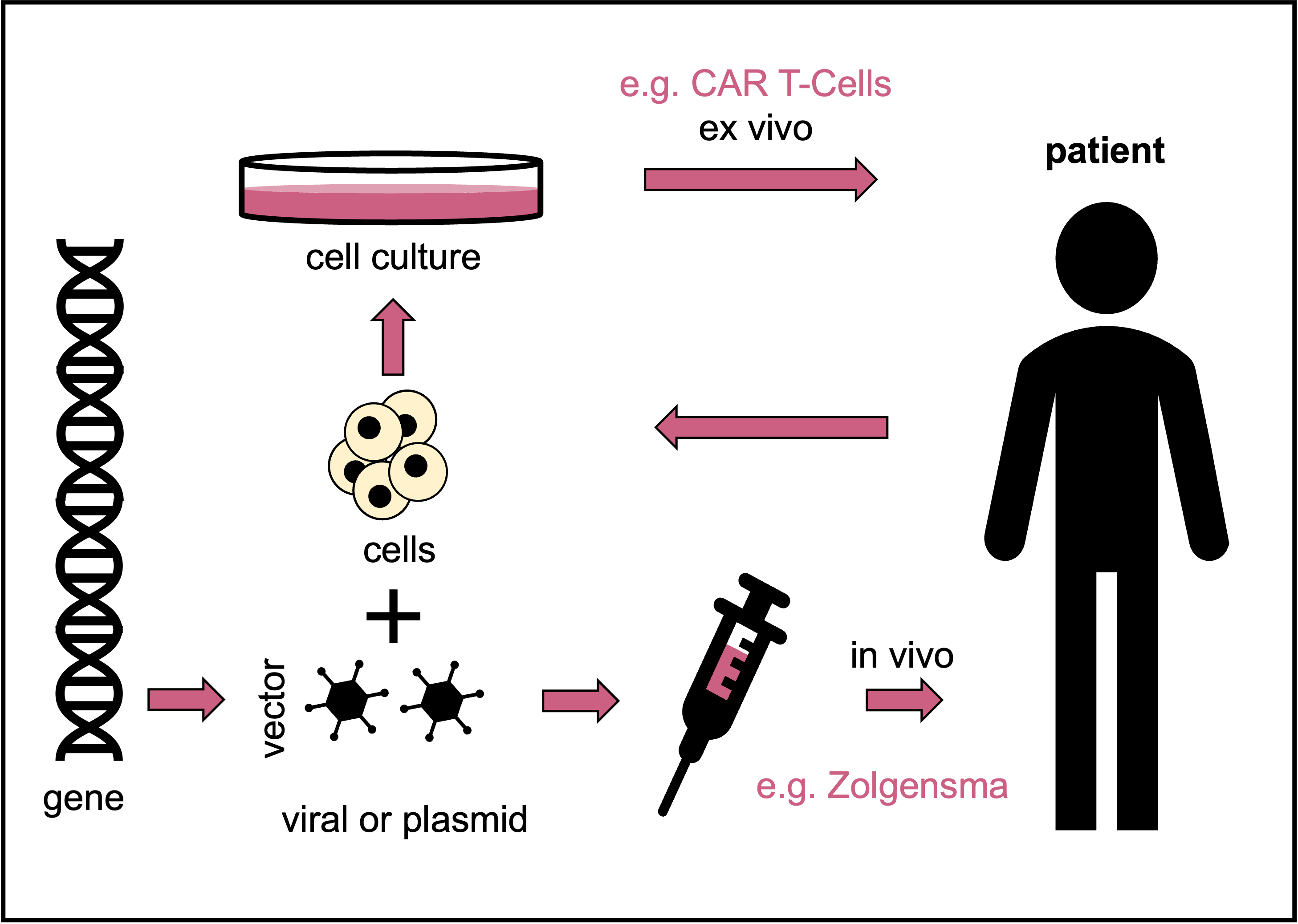 Gene therapy involves preventing or treating a disease caused by a defective gene. This is done by transferring appropriate nucleic acids into the affected cells to repair the relevant gene or by replacing it with a functional gene. Since interventions in the genes of germ cells or early embryonic cells, so-called germline gene therapies, are prohibited in Germany for ethical reasons, only ‘somatic gene therapy’, in which the therapeutic nucleic acid is introduced into somatic body cells, is discussed below. In somatic gene therapy, gene modification is restricted to the recipient and not passed on to any children.