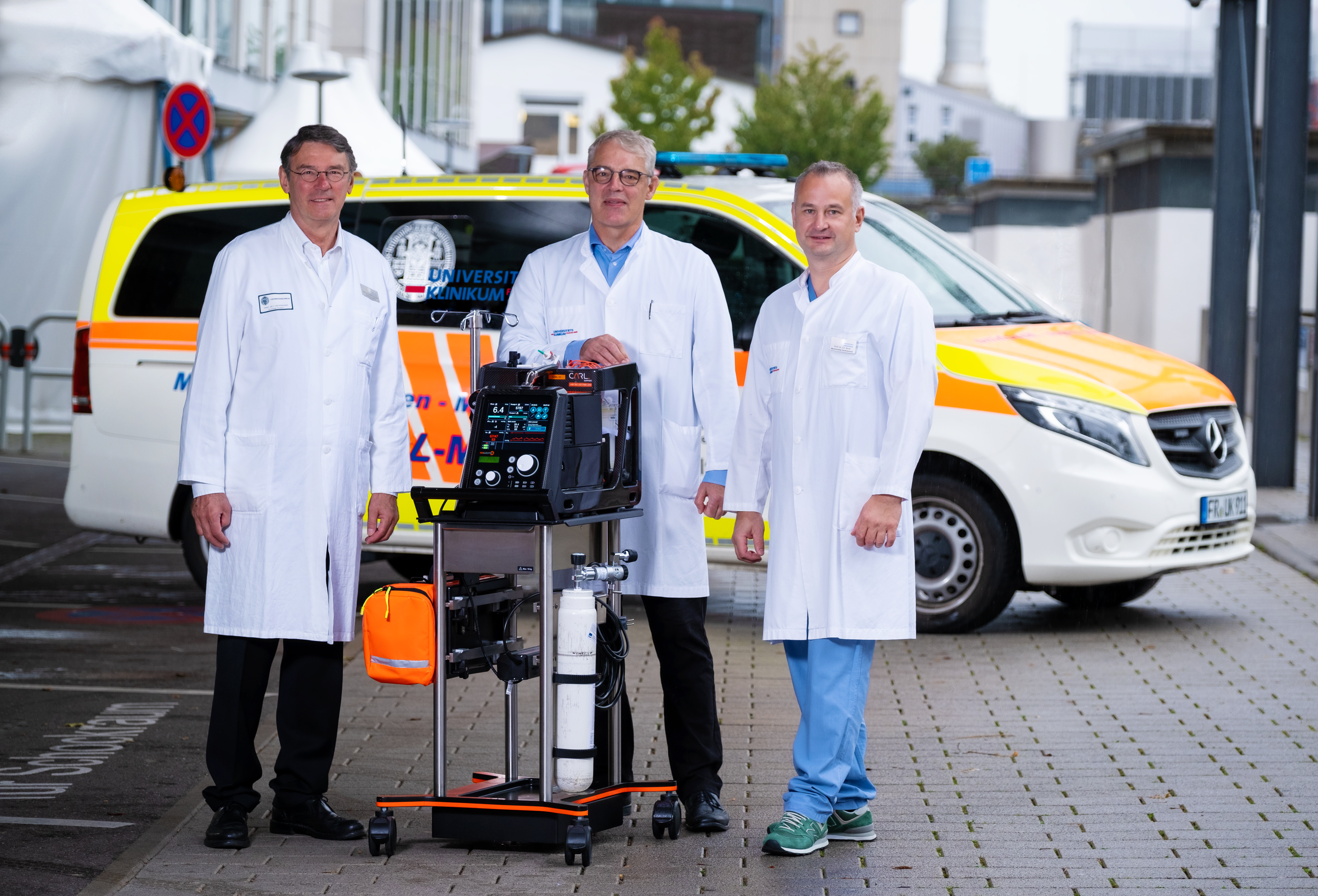 The innovative resuscitation system CARL (Controlled Automated Reperfusion of the whoLe body) was developed by Prof. Dr. Friedhelm Beyersdorf, Prof. Dr. Georg Trummer and Prof. Dr. Christoph Benk (from left to right) and their colleagues at the University Medical Centre Freiburg and Resuscitec GmbH. © University Medical Centre Freiburg"Thirty years ago, we were investigating whether it made sense to return unaltered blood to patients who had suffered sudden cardiac arrest. Such a line of enquiry did not take into account the pathophysiological causes," says Prof. Dr. Friedhelm Beyersdorf, former Medical Director of the Department of Cardiovascular Surgery at the University Medical Centre Freiburg. In decades of research, he and his colleague Prof. Dr. Georg Trummer, Head of Intensive Care Medicine, together with a large group of other researchers, first identified the therapeutic factors for successful reperfusion and then, together with Prof. Dr. Christoph Benk, Head of Cardiotechnology, developed a new type of small heart-lung machine specifically for resuscitation.