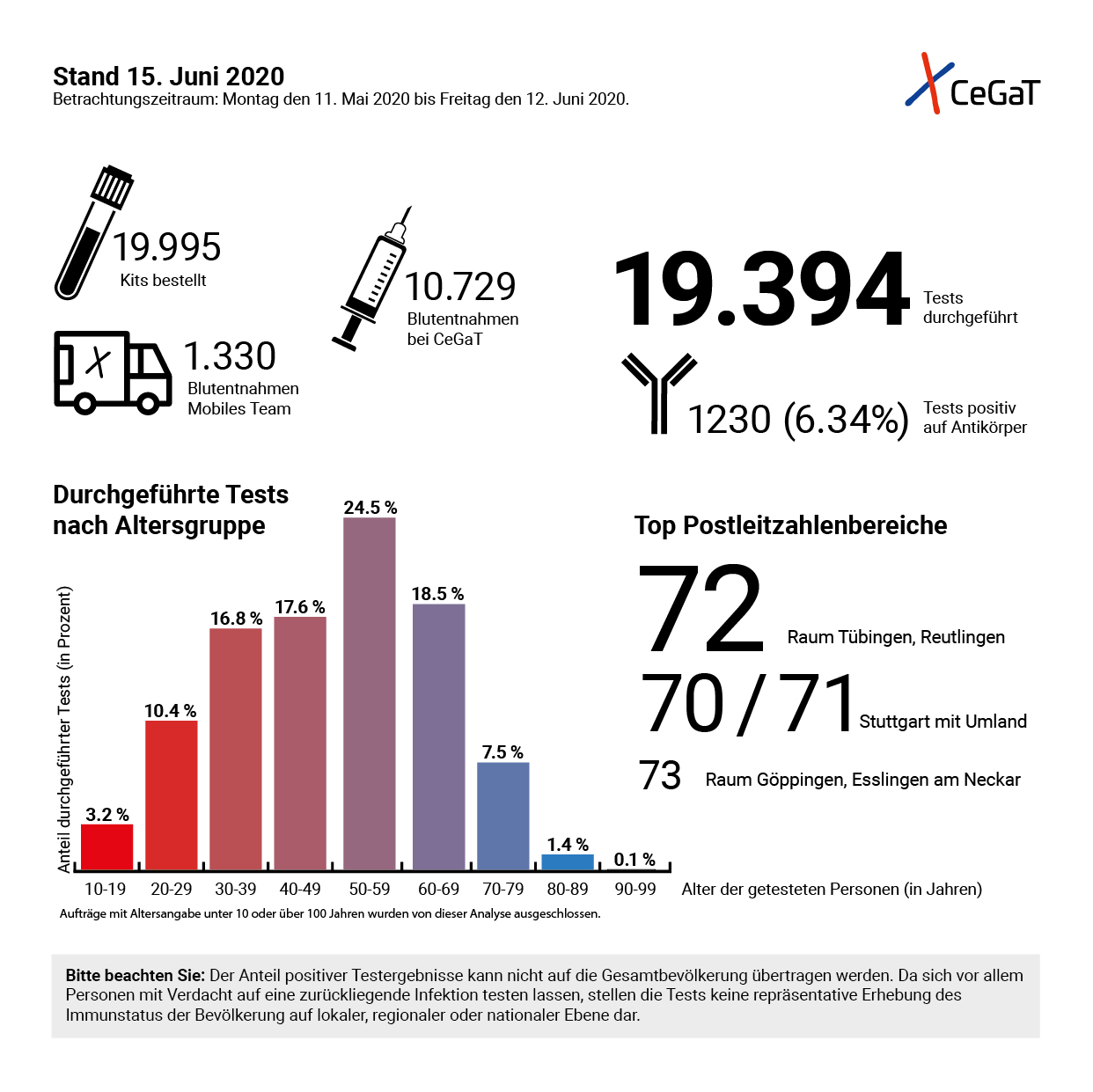Testing involves having a blood sample taken directly at the CeGaT company premises in Tübingen on weekdays, no appointment is necessary, or ordering a test tube on the biotech company's online system, having a blood sample taken at the doctor's clinic and sending the sample back to the CeGaT laboratory. The results are then returned a few days later by post along with the invoice. In addition, phlebotomy (blood taking) centres have been set up in Stuttgart, Bitterfeld, Dachau and Frankfurt am Main in cooperation with partners.