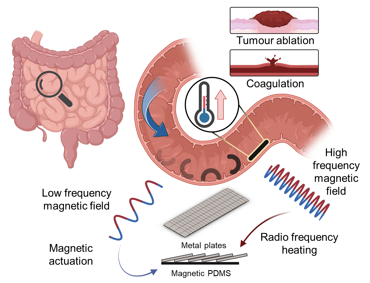 Schematic representation of how the wireless mini robot works in the small intestine. The device can be controlled using a low-frequency magnetic field; high frequencies cause the small aluminium plates to heat up, which can stop bleeding or destroy tumours, for example. Source: https://doi.org/10.1038/s41467-023-38689-x, Ren Hao Soon, CC BY 4.0 (https://creativecommons.org/licenses/by/4.0/)In their publication, the researchers demonstrate possible medical applications for the miniature robot. These included using an isolated pig stomach to simulate a vascular haemorrhage that could be stopped by administering an RF pulse for three seconds. The hyperthermia treatment of tumours, i.e. the overheating of cancer cells, is another potential field of application. After introducing tumour tissue into an isolated small pig intestine, the authors successfully navigated the robot to the tumour and destroyed the cells by heating them to 60 °C for five minutes.