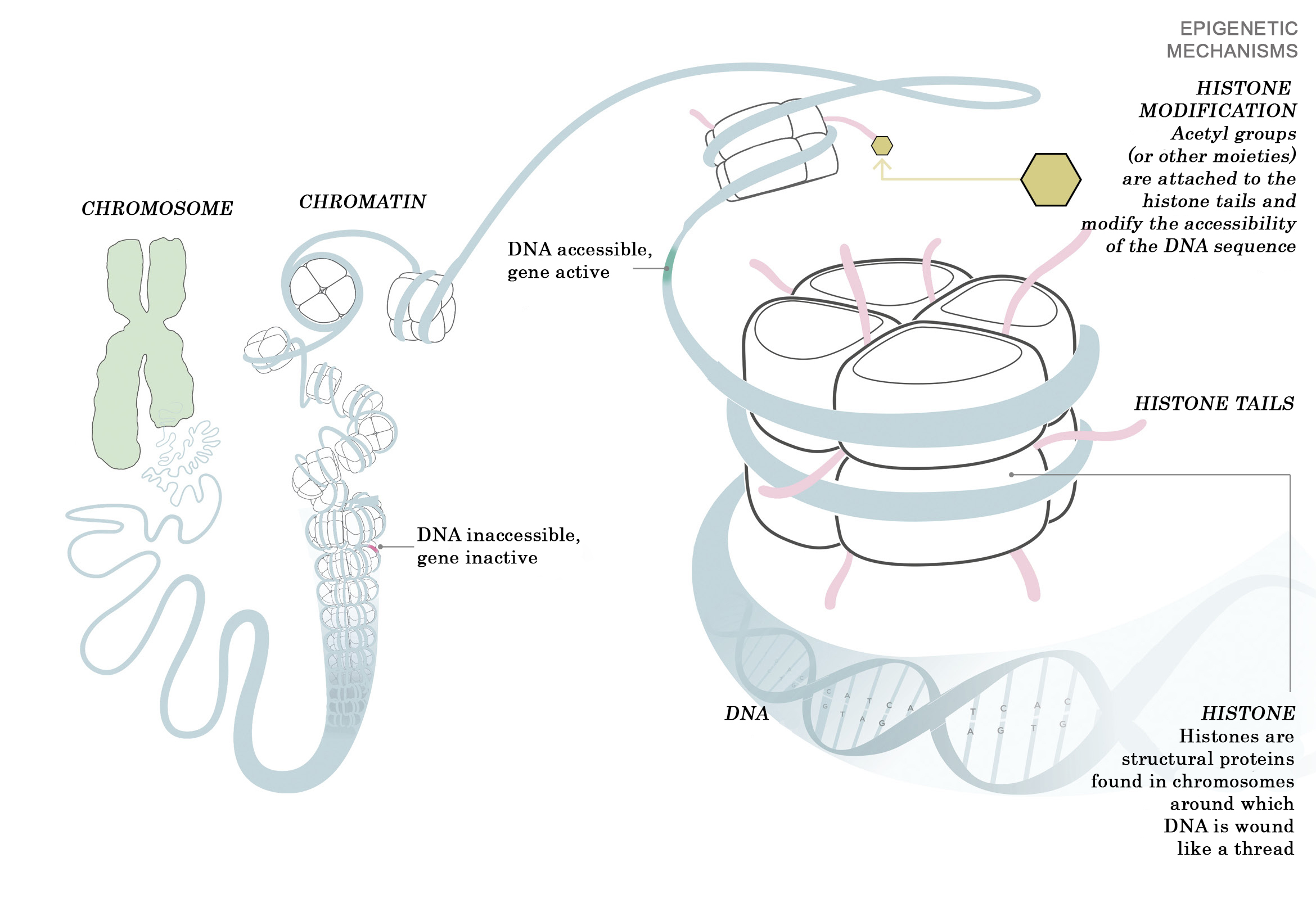 Schematic representation of chromatin and chromosome organisation and histone modifications. © GCO modified from MPI of Immunobiology and Epigenetics drawingIn Drosophila, the MSL (male-specific lethal) complex, which consists of at least 5 proteins (MOF, MSL1, MSL2, MSL3, MLE) and two non-coding RNAs (roX1 and roX2), is responsible for activating the X chromosome genes. MOF (males-absent on the first protein) is a catalytically active protein (enzyme), a histone acetyl transferase, which replaces the positive charge of a histone with a neutral acetyl residue (-COCH3). This weakens the contact between histone and DNA and loosens (opens) the affected region, making it accessible to the transcription machinery.