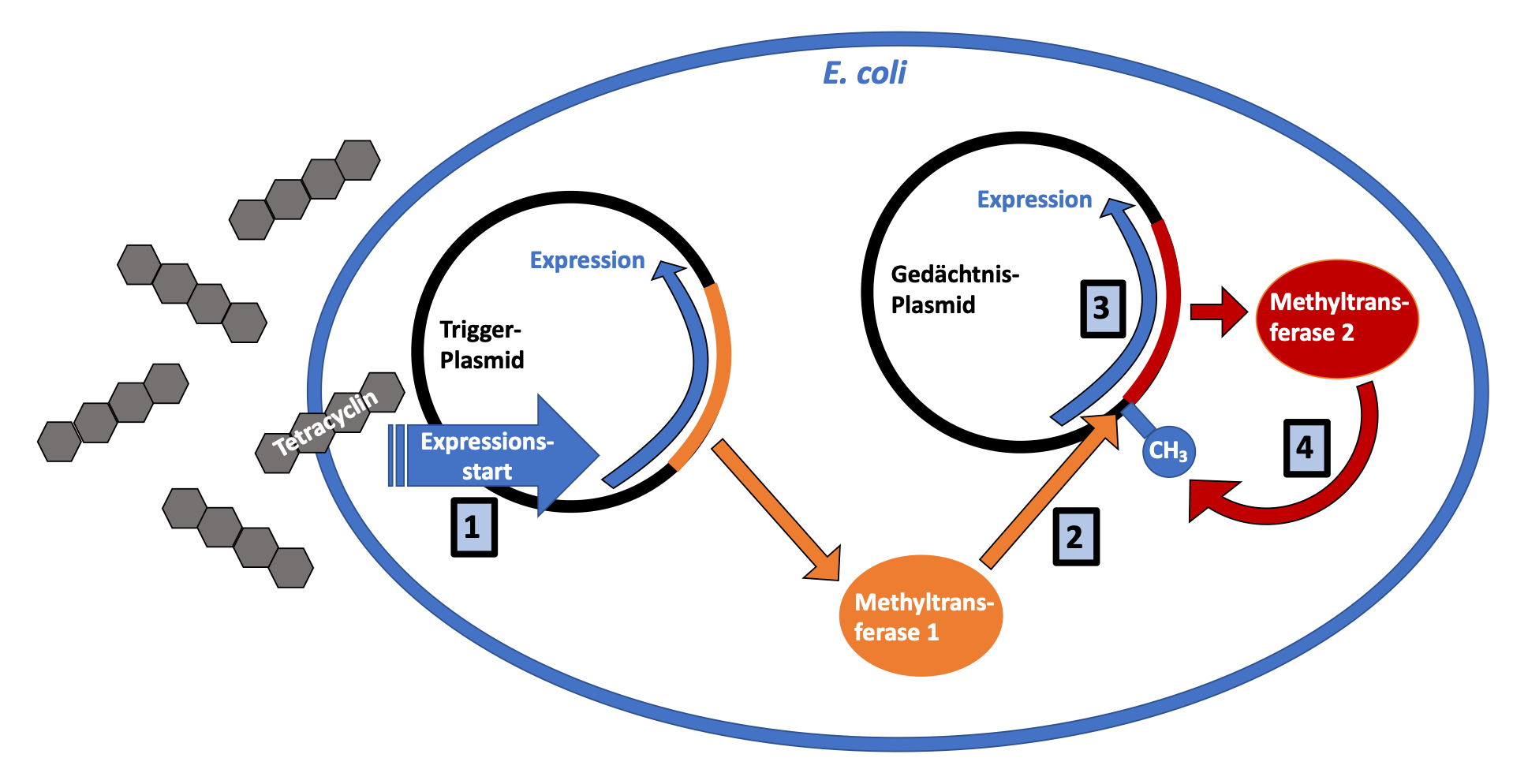 The bacteria obtained biosensory properties through two different synthetically produced DNA plasmids that form a memory system. Both plasmids were taken up by the bacteria by electroporation, a method that makes the bacterial membrane temporarily permeable via an electric field. The presence of the antibiotic tetracycline leads to the expression of a DNA methyltransferase from the first, so-called trigger, plasmid. This DNA methyltransferase then methylates a specific DNA sequence on the memory plasmid. The methylation of this sequence in turn initiates the expression of a second methyltransferase, whereby the presence of tetracycline is stored as methylation mark on the memory plasmid.