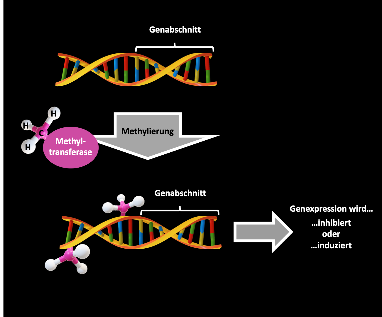 Gene regulation via DNA methylation: methyltransferases can attach methyl groups (-CH3) to specific DNA bases and thus inhibit or induce gene expression. © BIOPRO Baden-Württemberg GmbHDNA methylation as epigenetic marker