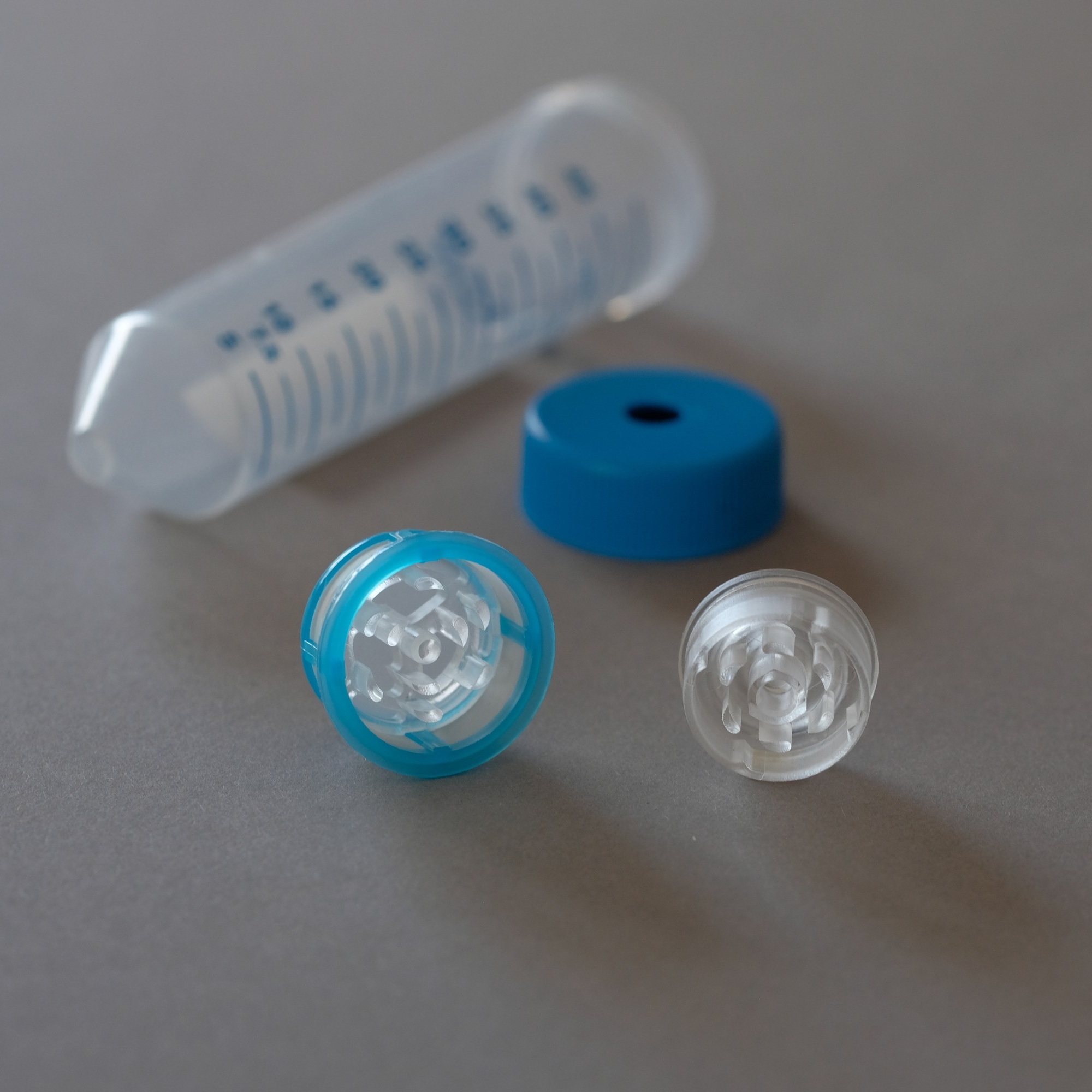 The tissue grinder works in a similar way to a spice grinder. The core of the device consists of a grinder, which is positioned in the lid of a standard centrifuge tube. It consists of two grinding discs, a rotor and a stator, equipped with counter-rotating teeth-like polycarbonate blades. The pieces of tissue are placed between these 'teeth'. A benchtop device, which can hold up to four grinding tubes at a time, then makes one of the grinder discs rotate. According to the company, the blades disintegrate the tissue within five minutes without damaging the cells.