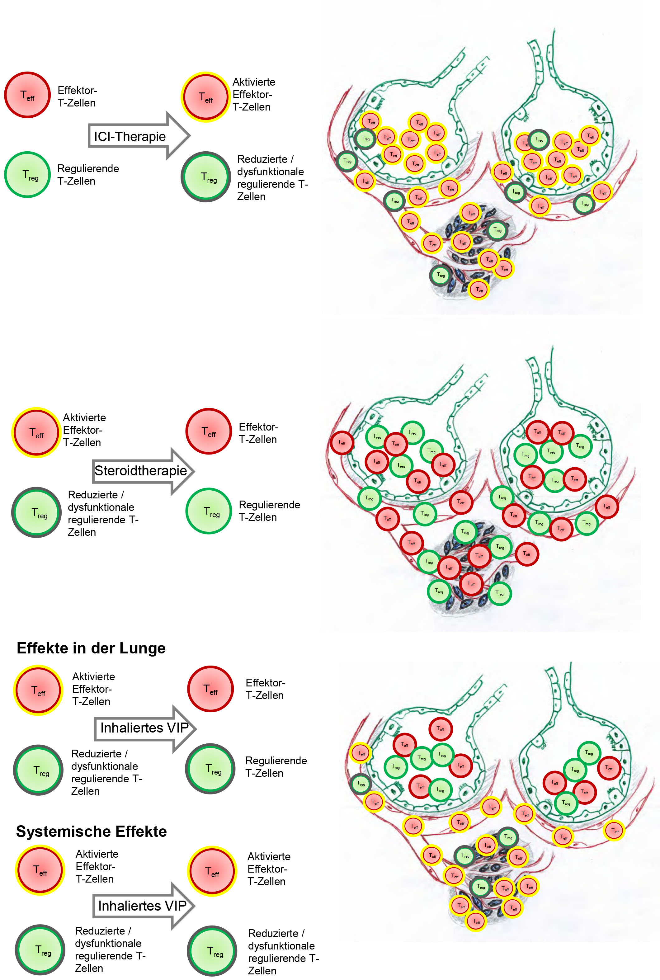 ICI (immune checkpoint inhibitor) immunotherapy activates effector T cells and conversely reduces the number of regulatory T cells in order to defeat the tumour (black cells). Pneumonia triggered by immunotherapy is treated with steroid therapy (cortisone) or with inhaled VIP (vasoactive intestinal peptide). VIP treatment attenuates the inflammation. © Dr. Björn Christian Frye - privateDue to the similarity of the inflammation of the lung in pneumonitis and sarcoidosis, the Freiburg scientists decided to apply the therapeutic approach that had been successful in sarcoidosis to a patient with pneumonitis in whom cortisone therapy did not lead to the desired outcome. The cause of sarcoidosis is still unclear, but there are indications that the patient's own immune system overreacts. The lungs are almost always affected, the disease causes clusters of inflamed tissue (granulomas) that impair lung function and lead to irritation of the throat and breathing difficulties. Cells from the lungs of sarcoidosis patients that have been examined have shown a high production of proinflammatory cytokines and few to zero regulatory T cells, as has also been observed in irAE pneumonitis. A study using an intestinal neuropeptide, the vasoactive intestinal peptide (VIP), will now investigate whether cough relief and an improvement in quality of life can be achieved in patients with sarcoidosis.