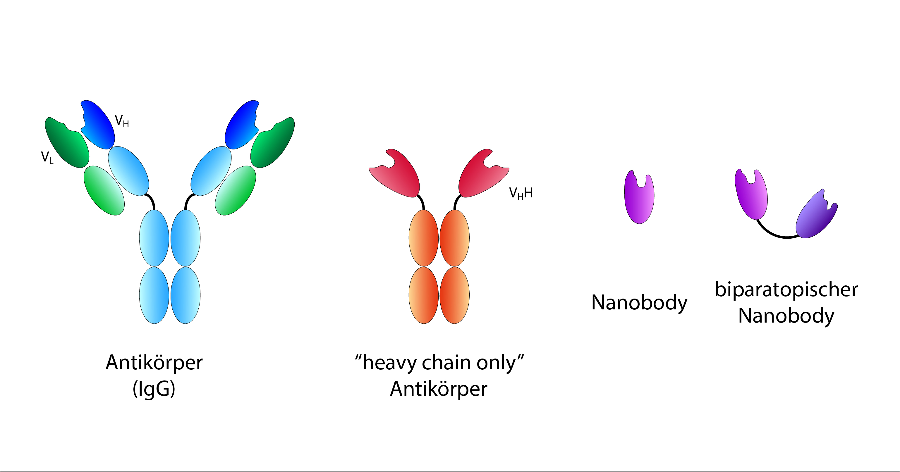 The antigen recognition site of a conventional antibody is formed jointly by the variable regions of the heavy (VH) and light (VL) chains. A nanobody corresponds to the variable region of a ‘heavy chain only’ antibody from camelids. Biparatopic nanobodies have two recognition domains with different specificities. © R. Menßen-FranzAntibodies of different classes are produced by all higher vertebrates and are found in the blood (IgG), tissue fluid and body secretions (IgA). Interestingly, members of the Camelidae family (camelids) (e.g. camels, alpacas, llamas, dromedaries) also possess another form of immunoglobulins, so-called ‘heavy chain only’ antibodies. These consist exclusively of two identical heavy chains, so the complete antigen-binding site is formed by only one variable region. This special feature was first described in 1993 and has since been increasingly used in research and therapy.