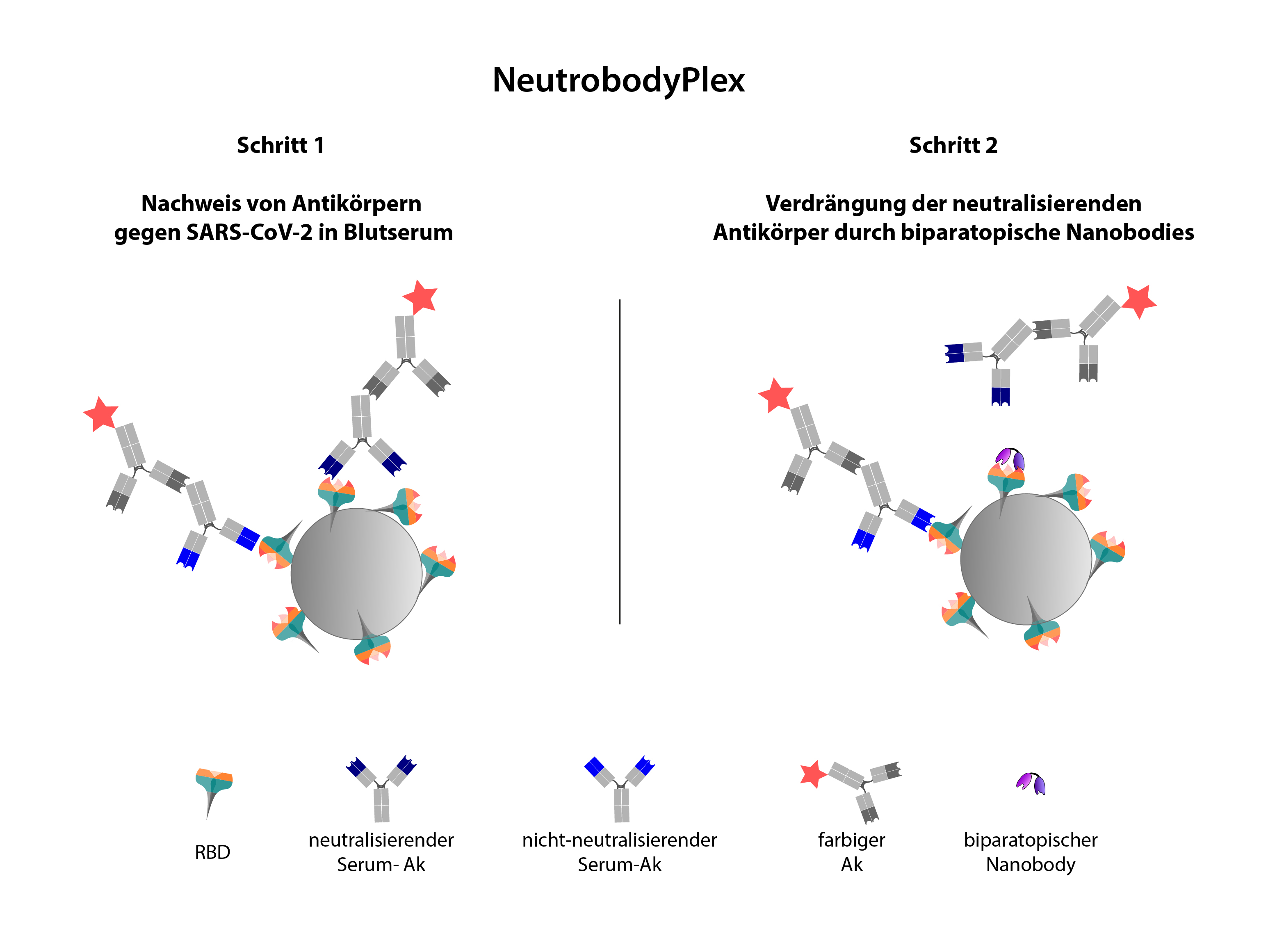 In a first step, the receptor-binding domain (RBD) is coupled to carrier beads. These are then incubated with blood serum so that the antibodies (Ab) present can bind. Their amount is measured using a second, coloured Ab. In a second step, biparatopic nanobodies are added, which specifically displace the neutralising Abs that can prevent the interaction between the RBD and the ACE2 receptor on human cells. The decrease in signal corresponds to the amount of neutralising Abs.
