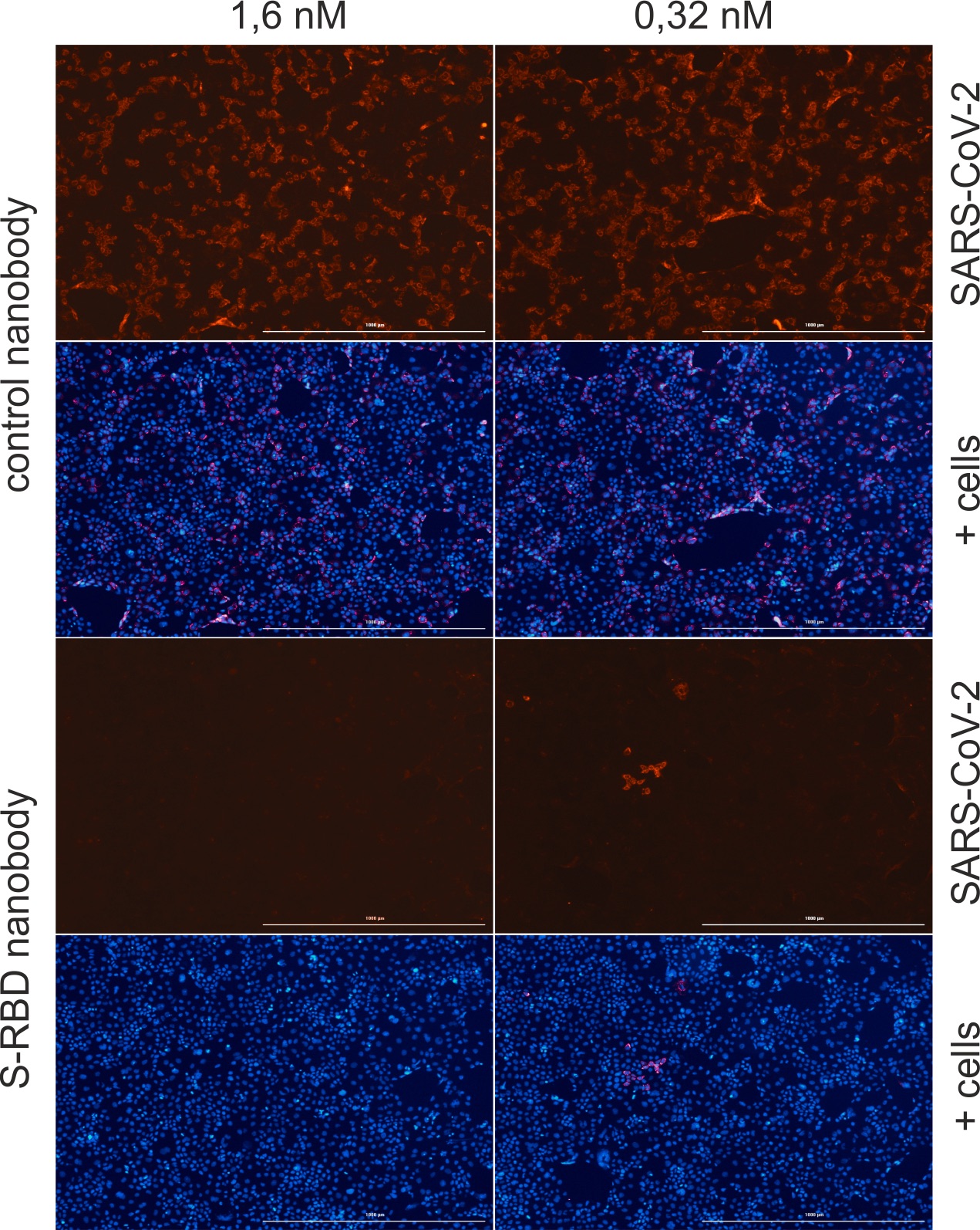 Human epithelial cells were infected with SARS-CoV-2 and simultaneously treated with a control nanobody (Nb) or an Nb against the receptor-binding domain of SARS-CoV-2 (S-RBD). After 40 hours, the nuclei (blue) and the nucleocapsid protein of SARS-CoV-2 (red) in the cells were stained and analysed under the fluorescence microscope. The S-RBD Nb prevents the viruses from entering the cells. © M. SchindlerIf, for example, the genetic information of a nanobody is introduced into mammalian cells in combination with a fluorescent protein, the host cells form a so-called chromobody that binds specifically to individual structures in living cells and makes them visible. In this way, changes in the cell can be monitored and, for example, the effects of drugs be examined in real time.