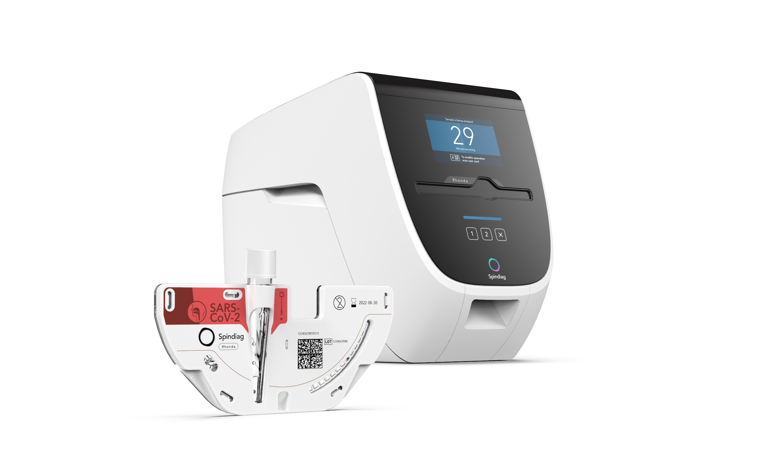 The test system consists of an analyser and a cartridge containing all the reagents required for the test. Swab samples from the nose or throat are inserted directly into the test cartridge, thus reducing users’ risk of infection to a minimum. The device can process two cartridges simultaneously, so that two samples can be analysed at the same time. The miniaturised laboratory procedure consists of about 30 individual steps and commences with the push of a button: