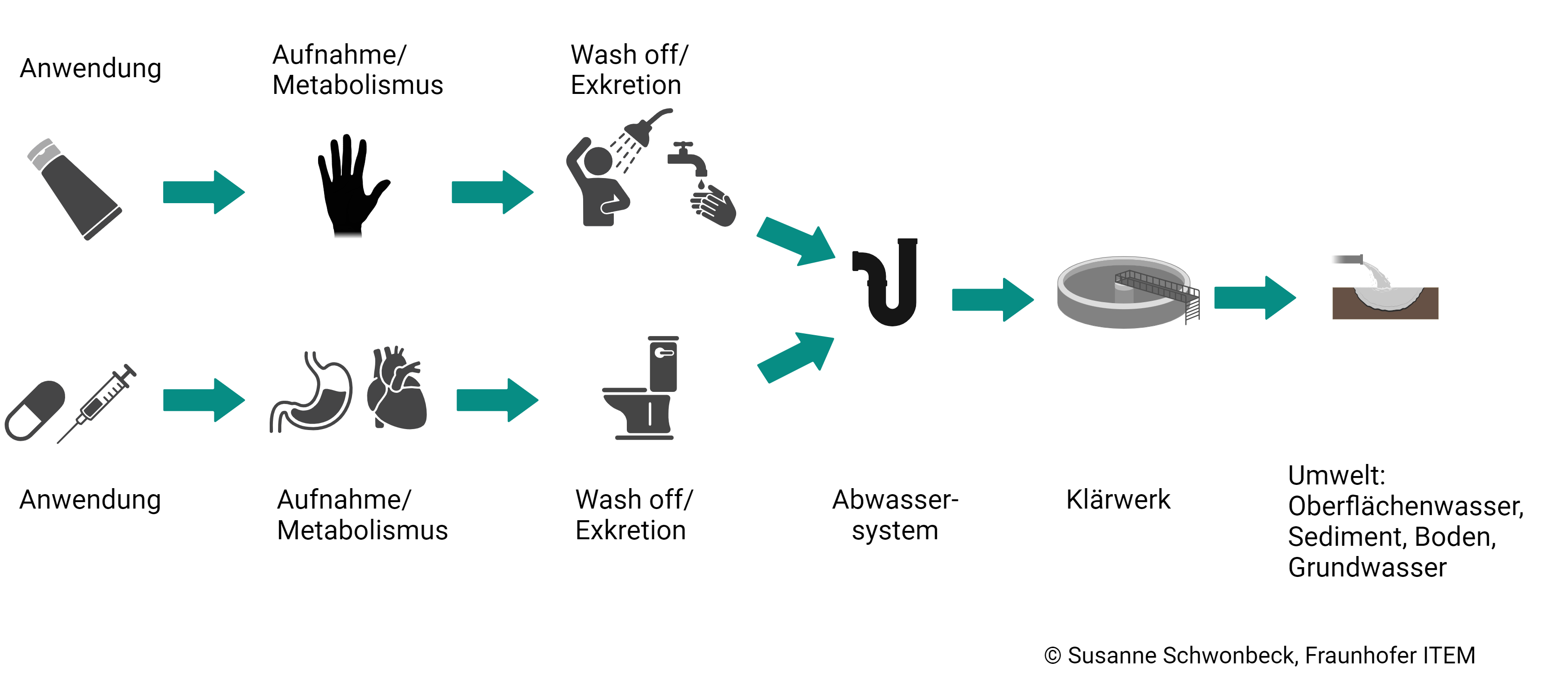 „Es geht bei der Umweltrisikobewertung nicht nur um den Erhalt einer lebenswerten und intakten Umwelt, sondern auch um den Schutz des Menschen“, betont daher Dr. Susanne Schwonbeck vom Fraunhofer-Institut ITEM. Die Wissenschaftlerin befasst sich seit Jahren mit dem Thema Umweltrisikobewertung und berät auch Unternehmen hierzu. Als Ursachen für Arzneimittelrückstände in der Umwelt nennt sie sowohl Erzeugung, Nutzung als auch Entsorgung. Bei der Produktion von Pharmazeutika, die überwiegend außerhalb Europas stattfindet, geraten Wirkstoffe beispielsweise durch Abwässer in die Umwelt. Dasselbe geschieht, wenn sie von Menschen eingenommen oder Tieren verabreicht und später wieder ausgeschieden werden. Und auch bei der unsachgemäßen Entsorgung von Medikamenten können große Mengen an Arzneimittelrückständen freigesetzt werden. „Das Schlimmste, was Sie tun können, ist, Medikamente die Toilette hinunterzuspülen“, sagt Schwonbeck. „Am sichersten ist es, sie über den Hausmüll zu entsorgen. Der wird später verbrannt.“ Auch die Abgabe in der Apotheke sei eine gute Möglichkeit.