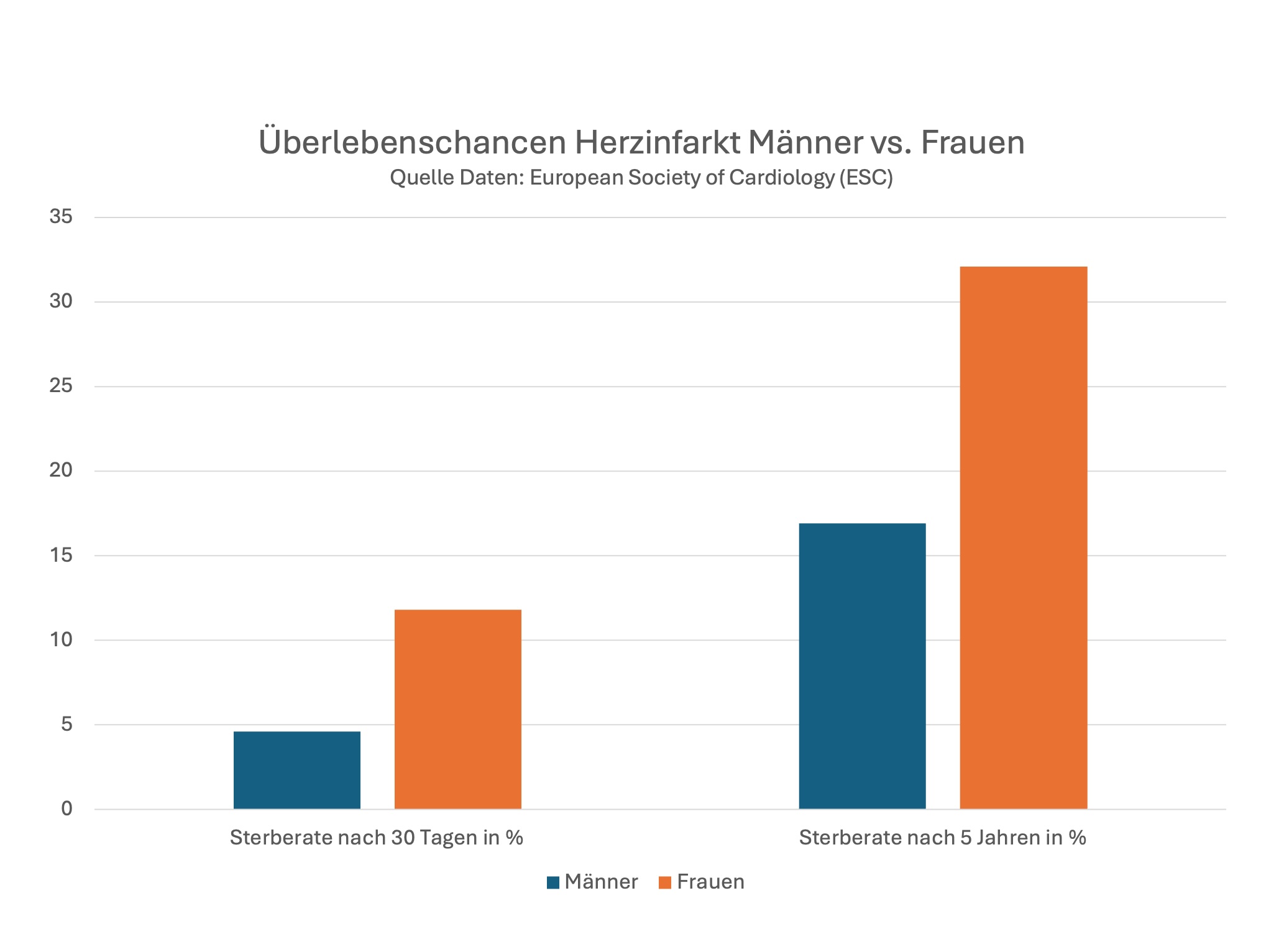 Frauen haben auch heute noch ein doppelt bis fast dreifach so hohes Risiko, an einem Herzinfarkt zu sterben wie Männer und werden später im Krankenhaus aufgenommen, belegt eine Studie, die die European Society of Cardiology (ESC) 2023 (1) vorgestellt hat. Selbst um verschiedene Risikofaktoren bereinigt, waren der Studie zufolge nach 30 Tagen 11,8 % der Frauen im Vergleich zu 4,6 % der Männer verstorben. Nach fünf Jahren waren 32,1 % der Frauen gegenüber 16,9 % der Männer verstorben. © Dr. Anja SegschneiderIn den 1980er Jahren machte die amerikanische Kardiologin Marianne J. Legato eine Entdeckung, die sie völlig verblüffte: Viele ihrer Herzinfarkt-Patientinnen zeigten nicht die typischen Symptome wie Schmerzen in Brust und Armen. Stattdessen litten sie unter Schweißausbrüchen, Übelkeit sowie Rücken-, Kopf- und Nackenschmerzen. Die Folge: Ärztinnen und Ärzte taten den lebensbedrohlichen Zustand der Frauen ab und schickten die Patientinnen mitunter einfach wieder nach Hause – nicht selten mit fatalem Ausgang. Legato war schockiert. Konnte es sein, dass Frauen bei Herzerkrankungen ganz andere Symptome zeigten als Männer? Und wenn ja, wie war es möglich, dass selbst ausgebildete Ärztinnen und Ärzte davon nichts wussten? Legato hatte ihr neues Fachgebiet gefunden. Heute gilt sie als eine der Begründerinnen der Gendermedizin.2)