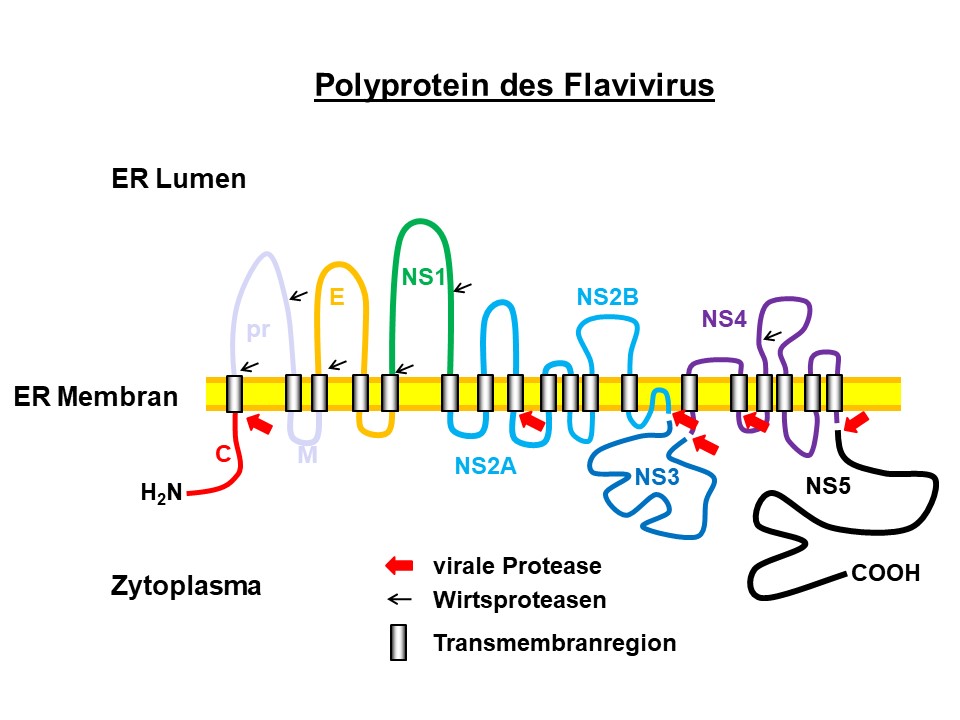 Basierend auf der (+)-RNA-Vorlage wird das virale Protein am rauen Endoplamatischen Retikulum (ER) synthetisiert und in die ER-Membran eingebaut. Virale Proteasen, aber auch Wirtsproteasen, setzen durch Spaltung der Proteinkette die verschiedenen Virusproteine frei. © C. KleinDie Arbeitsgruppe Pharmazeutische und Medizinische Chemie von Prof. Dr. Christian Klein am Institut für Pharmazie und Molekulare Biotechnologie (IPMB) der Universität Heidelberg erforscht seit mehr als zwölf Jahren Wirkstoffe gegen virale Zoonosen. Der Fokus der Forschenden liegt hierbei auf von der Gattung Flavivirus verursachten Erkrankungen. Zu diesen zählen die in Deutschland durch Zecken verbreitete Frühsommer-Meningoenzephalitis (FSME), aber auch die eher in den Tropen auftretenden Zika-, Dengue- und West-Nil-Fieber. Letztere werden durch Mücken übertragen und zeigen oft lebensbedrohliche Verläufe.
