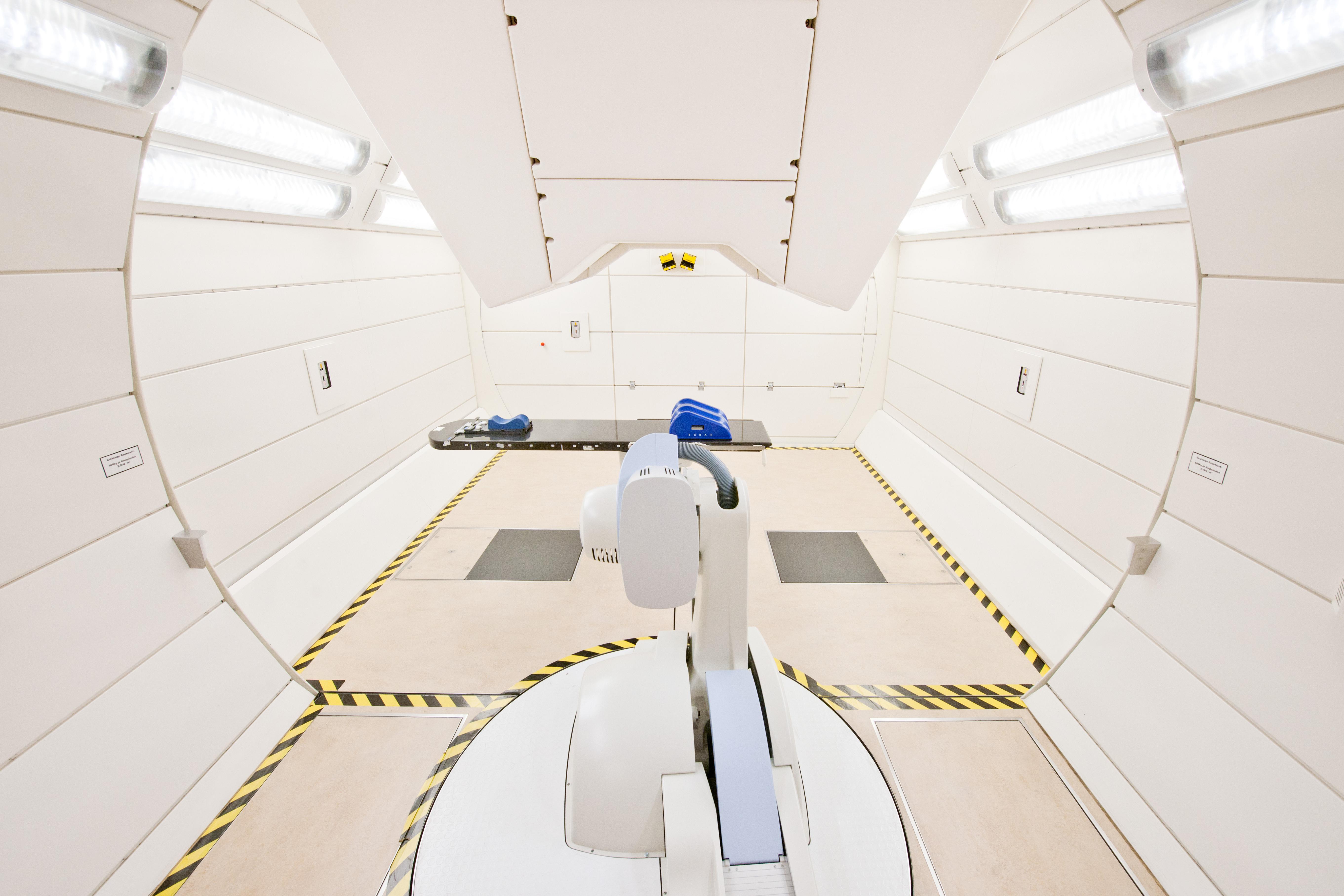 Bestrahlungsraum mit einer um 360° drehbaren Bestrahlungsquelle, der sogenannten Gantry. So kann der Ionenstrahl aus jeder Richtung auf den Tumor gelenkt werden. Es gibt am HIT noch zwei weitere Behandlungsplätze mit fester horizontaler Strahlführung. © Universitätsklinikum HeidelbergBei der Schwerionentherapie wird der Tumor mit positiv geladenen Kernen von Kohlenstoff-, Sauerstoff- oder Heliumatomen bestrahlt. In der vorliegenden Studie wurde an Zellkulturen und Mausmodellen untersucht, wie das Glioblastom auf die Bestrahlung mit Kohlenstoff-Ionen reagiert. Dabei werden die geladenen Teilchen auf über drei Viertel der Lichtgeschwindigkeit beschleunigt. Sie legen also ungefähr 225.000 Kilometer pro Sekunde zurück. Sie können bis zu 30 Zentimeter tief ins Gewebe eindringen und werden dabei kaum abgeschwächt, sodass der wesentliche Teil der Energie an das Tumorgewebe abgegeben wird. Bei dieser Art der Bestrahlung sind es die Kohlenstoff-Ionen selbst, die am Erbgut Schäden verursachen. Diese können Tumorstammzellen und hypoxische Zellen nicht reparieren. Durch die Vernichtung der hypoxischen Zellen verändert sich zudem das Tumormilieu: Die Wissenschaftler konnten zeigen, dass sich die Komposition des Immunsystems günstig verändert und im Vergleich zur konventionellen Bestrahlung weniger Immunabwehr-schwächende Zellen an den Tumor gelangen. Somit könnte das Glioblastom eventuell auch für Immuntherapien zugänglich gemacht werden, die bei verschiedenen anderen Krebsarten bereits erfolgreich sind.