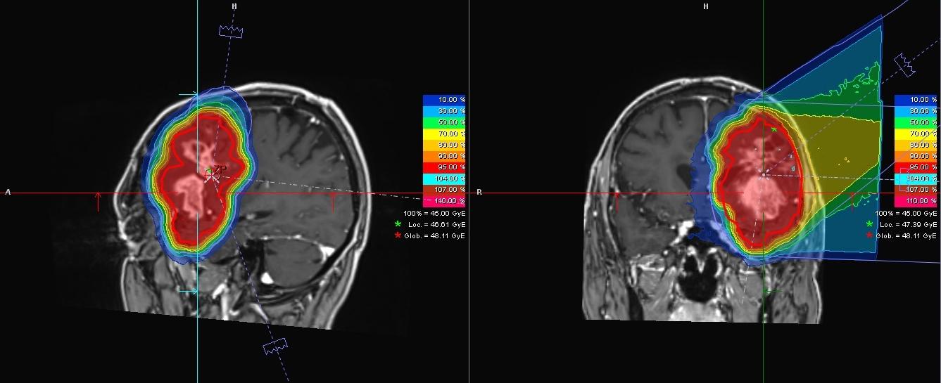 Die Aufnahmen zeigen das Glioblastom eines 55-jährigen Patienten in der Nähe der linken Schläfe. Der Tumor wurde mittels Magnetresonanztomographie (MRT) aus verschiedenen Perspektiven aufgenommen. Die Farben zeigen die Verteilung der geplanten Strahlendosis: Im Bereich des Tumors ist sie am höchsten (rot), mit zunehmender Entfernung zum Tumor wird sie immer niedriger. © Universitätsklinikum HeidelbergDie Schwerionentherapie kann auch unerwünschte Nebenwirkungen haben. Denn häufig sind Tumorgewebe und gesundes Gewebe miteinander vermischt, wobei das gesunde Gewebe einwandfrei funktioniert. „Es ist manchmal beeindruckend“, sagt Debus, „dass Patienten, die einen Tumor im Sprachzentrum haben, ganz normal sprechen können.“ Es kann dann sein, dass das gesunde Gewebe bei der Schwerionentherapie mitreagiert und geschädigt wird. „Es lässt sich keine generelle Aussage treffen“, erklärt Debus, „aber im Einzelfall kann man sagen, wie hoch die Wahrscheinlichkeit für bestimmte Nebenwirkungen ist.“