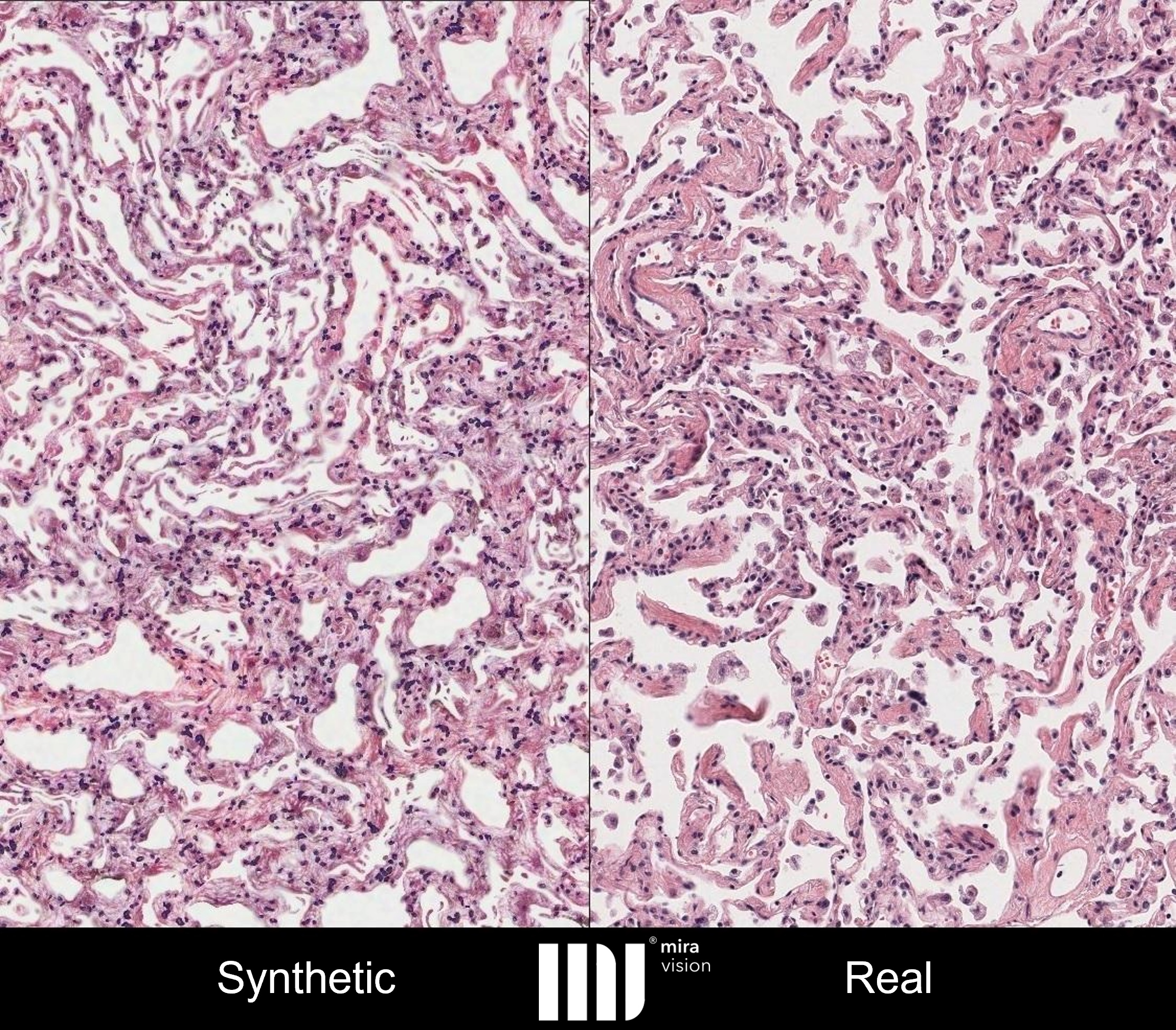 Das mit dem innovativen Verfahren von MIRA Vision generierte synthetische Bild eines angefärbten Lungengewebes (links) lässt sich nicht von einer echten Mikroskopieaufnahme (rechts) unterscheiden. © MIRA Vision Microscopy GmbHMit all diesen Herausforderungen hatte Mill auch während seiner Zeit bei Prof. Dr. Andreas Maier am Lehrstuhl für Mustererkennung der Friedrich-Alexander-Universität Erlangen-Nürnberg (FAU) zu kämpfen. Dort arbeitete er an verschiedenen Forschungsprojekten zu KI-unterstützter Bildanalyse im medizinischen Bereich. Der Mechatroniker schildert: „Um schneller und mit deutlich weniger Aufwand an das benötigte Datenmaterial zu gelangen, habe ich eine alternative Technologie entwickelt. Mit dieser können wir jetzt fotorealistische Bilder erzeugen. Also synthetische Bilder, die nicht von realen Mikroskopieaufnahmen zu unterscheiden sind.“