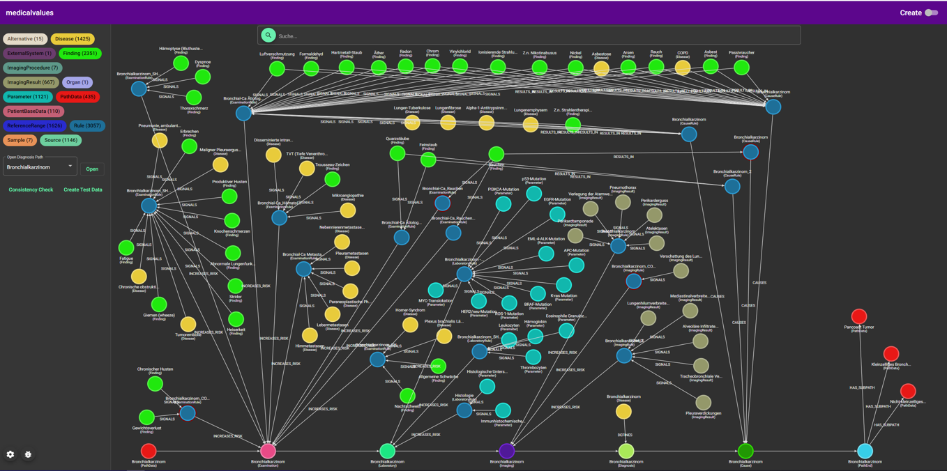 Diagnostischer Pfad für die Indikation Bronchialkarzinom: In dem Graph wird das medizinische Wissen auf Basis aktueller Leitlinien und evidenzbasierter Medizin abgebildet. Der Diagnostikprozess wird damit für jedes individuelle Krankheitsbild modelliert. © medicalvalues GmbHAbhilfe könnte eine neue Anwendung der Künstlichen Intelligenz (KI) schaffen: Das Karlsruher Start-up medicalvalues GmbH hat mit seinem Entscheidungsunterstützungssystem eine ganz neue Möglichkeit geschaffen, wie Künstliche Intelligenz Ärztinnen und Ärzte sowie Labore in ihrer Tätigkeit unterstützen kann. "Die Komplexität der Diagnostik ist sehr hoch, sodass es den Behandelnden nicht immer möglich ist, allen theoretisch verfügbaren diagnostischen Informationen innerhalb der vorhandenen Behandlungszeit vollständig gerecht zu werden. Viele labormedizinische Parameter bedingen sich gegenseitig und sind isoliert betrachtet oft nur schwierig zu bewerten“, erklärt Carmen Diker, Go-to-Market-Managerin bei medicalvalues. "Wir möchten die bestmögliche, individuell auf den Patienten abgestimmte Diagnostik ermöglichen." Dafür vereinen die Gründenden mithilfe des maschinellen Lernens zahlreiche medizinische Fachgebiete und Forschungswissen in einem Knowledge Graph (Wissensdatenbank).