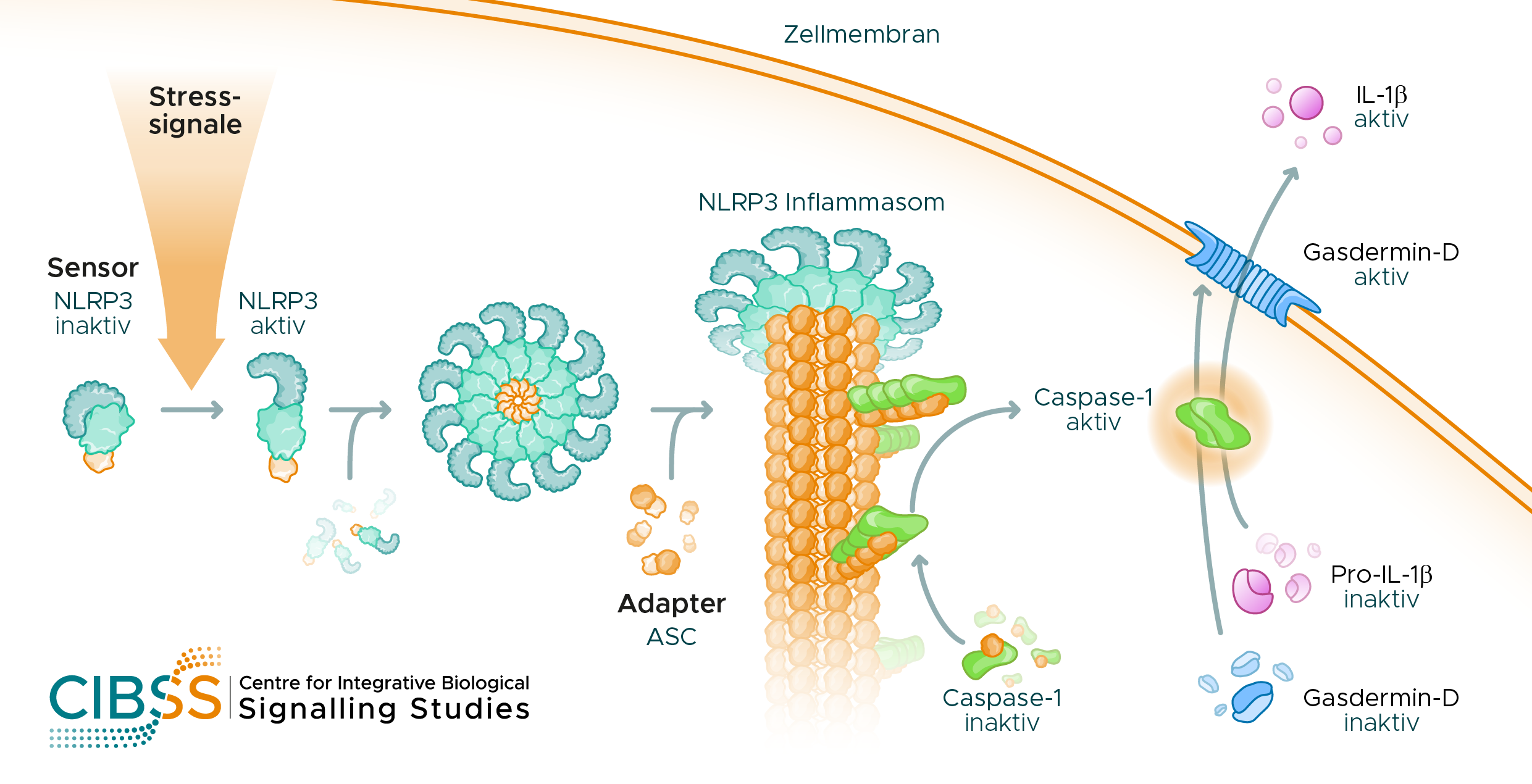 Makrophagen schütten nach ihrer Aktivierung entzündungsfördernde Zytokine aus. Diese locken andere Immunzellen an und aktivieren diese, sodass Eindringlinge oder auch Krebszellen gezielt bekämpft werden können. Besonders wirksam sind die Zytokine der Interleukin-1 (IL-1)-Familie, allen voran IL-1β. Die Ausschüttung von IL-1β wird durch das Inflammasom gesteuert, ein Multiproteinkomplex im Zytosol der Makrophagen, der sich aus jeweils mehreren Kopien eines Sensormoleküls, des Adapterproteins ASC, und der inaktiven Vorstufe des Enzyms Caspase-1 zusammensetzt. Der Komplex bildet sich erst, nachdem die Zelle Gefahrensignale, ausgehend von Pathogenen oder Schadstoffen, erkannt hat und führt zur Aktivierung von Caspase-1. Diese produziert reifes IL-1β und spaltet Gasdermin-D, ein Protein, das daraufhin Poren in der Zellmembran bildet, durch die die Zytokine austreten können.
