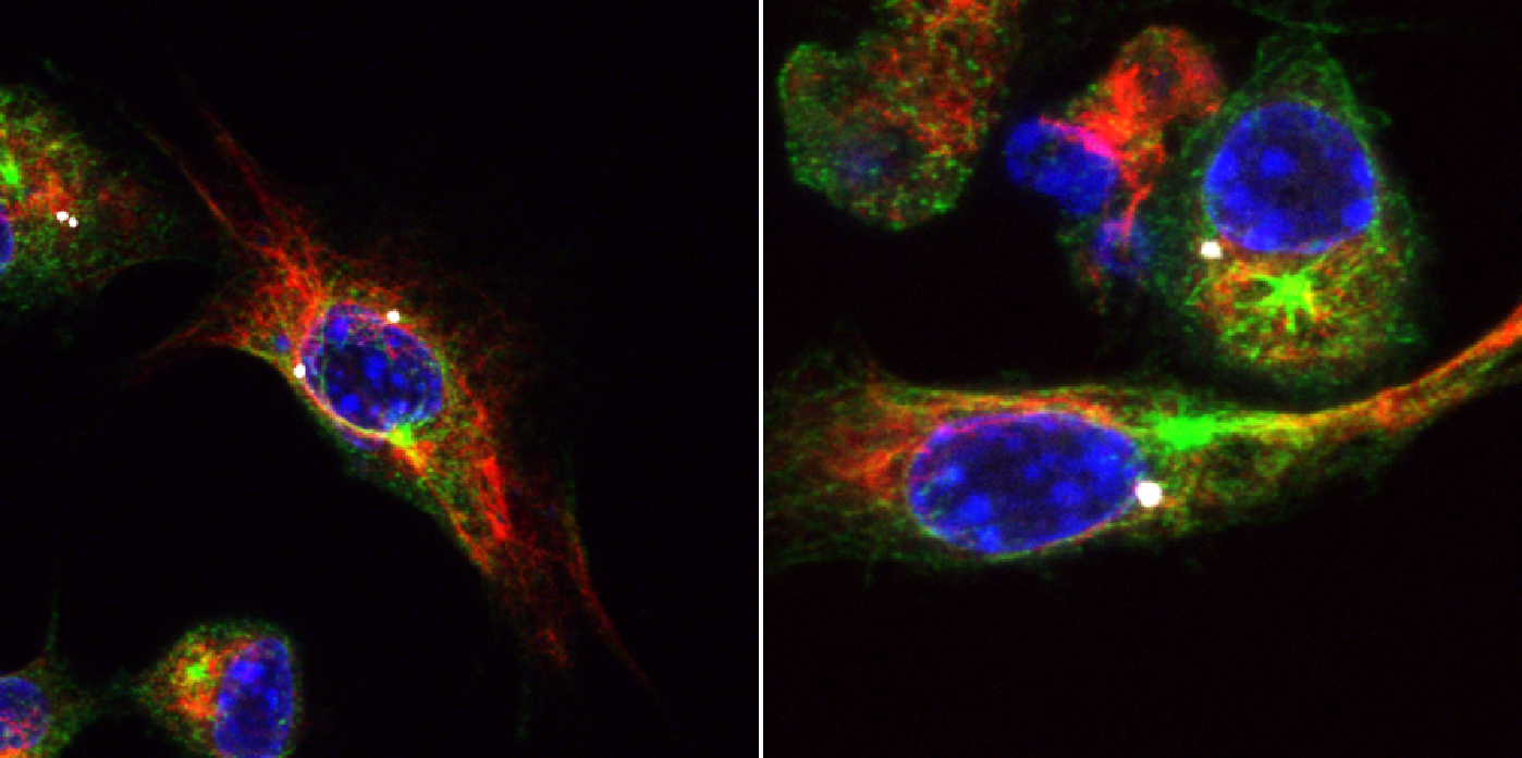 Makrophagen nach Inflammasom-Aktivierung. Fluoreszenzmikroskopische Aufnahme mit aktiviertem Inflammasom (weiß), Zellkernen (blau) und den Strukturproteinen Tubulin (grün) und β-Aktin (rot). © CIBSS, Universität FreiburgBisher gibt es keine zugelassenen Medikamente, die das NLRP3 Inflammasom hemmen können, auch weil die auslösenden Signalketten noch unbekannt sind. „Die Strategie meines Labors ist es, den Mechanismus von Aktivatoren zu untersuchen, um besser verstehen zu können, was NLRP3 sieht. Wenn ich das mechanistisch verstanden habe, kann ich bessere Inhibitoren entwickeln“, erläutert der Grundlagenforscher. Auf der Suche nach Wirkstoffen, die das NLRP3 Inflammasom aktivieren, hat sein Team ein neues Testverfahren entwickelt und damit eine Sammlung aus 50.000 chemischen Substanzen untersucht. In diesem „Compound Screen“ konnten die Wissenschaftler mehrere Molekülklassen identifizieren, die eine deutlich bessere Wirksamkeit und auch Spezifität aufzeigen als die bisher bekannten Aktivatoren. Eine der großen Aufgaben der nächsten Jahre ist die Entschlüsselung des Signalmechanismus einschließlich direkter Interaktionspartner, um so eine Grundlage für die Entwicklung von Inhibitoren zu schaffen. Dies wird vor allem im Rahmen und in Zusammenarbeit mit anderen Gruppen des Exzellenzclusters CIBSS (Centre for Integrative Biological Signalling Studies) der Universität Freiburg stattfinden.