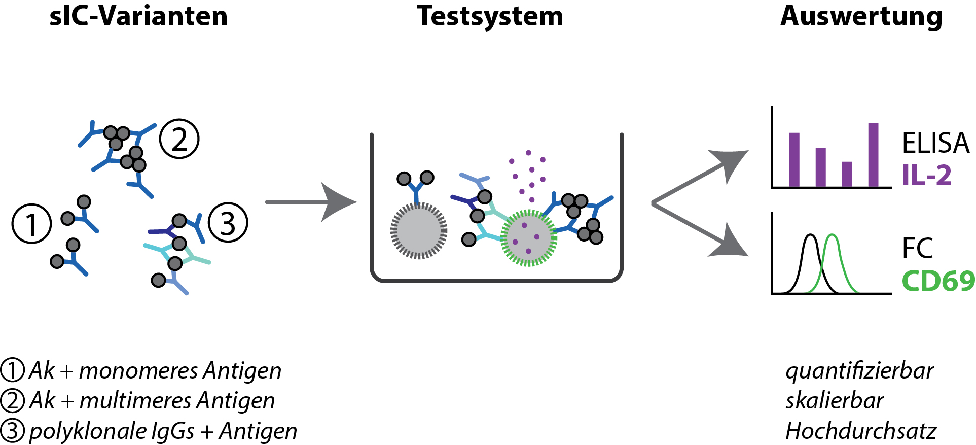 Lösliche Immunkomplexe (sICs) können unterschiedlich groß sein, je nachdem ob das Antigen nur eine Antikörperbindungsstelle/Epitop (1), mehrere identische Epitope (2) oder verschiedene Epitope, die von unterschiedlichen Antikörpern erkannt werden (3), besitzt. Nur die Bindung von sICs, die mehrere Antikörper enthalten, führt zur Aktivierung der Reporterzellen und Ausschüttung von Interleukin-2 (IL-2, lila) sowie Bildung von CD69 (grün). Beide Signale können quantitativ entweder mithilfe der ELISA-Technik oder Durchflusszytometrie (FC) ausgewertet werden.