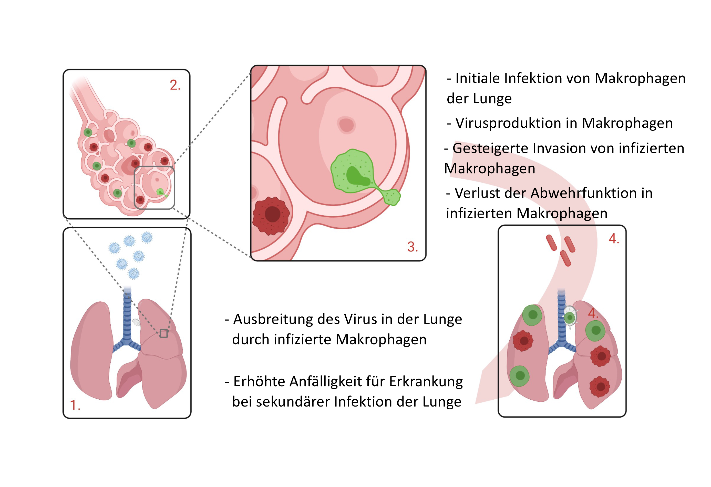 Nachdem die Zytomegalieviren in die Lunge eingedrungen sind, werden gesunde Makrophagen (dunkelrot) infiziert, welche dann als CMV-Makrophagen (grün) die weitere Verbreitung in Lunge und Lymphknoten vorantreiben. © Prof. Dr. Philipp Henneke, Uniklinik FreiburgDie ersten Abwehrzellen, die bei Tröpfcheninfektion in Kontakt mit CMV kommen, sind die Alveolar-Makrophagen in der Lunge. Diese spezialisierten Fresszellen sitzen in den kleinen Lungenbläschen (Alveolen). Wenn Allergene oder Mikroorganismen in die Lunge gelangen, werden die Alveolar-Makrophagen aktiv, fressen diese winzigen Fremdkörper mittels Phagozytose und übernehmen so die erste Immunabwehr des Lungengewebes. Dringt eine größere Zahl von Mikroorganismen ein, so geben Alveolar-Makrophagen zusätzlich Botenstoffe in Form von Zytokinen ab, die andere Immunzellen wie neutrophile Granulozyten anlocken und somit eine Entzündungsreaktion auslösen. „Wir wissen, dass ein einzelner Alveolar-Makrophage für drei Lungenbläschen zuständig ist“, sagt Henneke. „Diese Zellen bewegen sich zuverlässig nur in ihrem Territorium von Lungenbläschen.“
