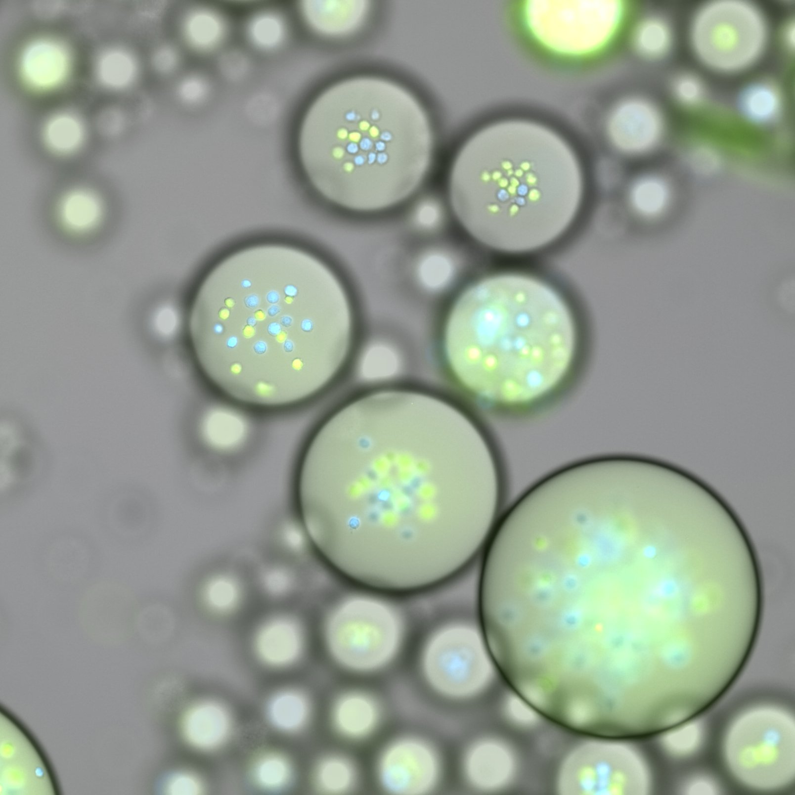 Fluoreszierende Zellen in Tröpfchen. Die Fluoreszenzreaktion kann entstehen, wenn der Antikörper den gewünschten Effekt zeigt. © VelabsAuf diese Weise können auch kleinste Mengen des Ausgangsmaterials zuverlässig analysiert werden – und das in enormer Geschwindigkeit. „Mehrere hundert Tests pro Sekunde können wir mit unserer Mikrofluidik-basierten Hochdurchsatz-Screening-Technologie in Echtzeit durchführen und sparen dabei immens viel Zeit“, so Antz. „Wir nutzen sie vor allem, um nach Antikörpern gegen spezialisierte Membranrezeptoren wie G-Protein-gekoppelten Rezeptoren (GPCRs) oder Ionenkanälen – beide wichtige Regulatoren der Zell-zu-Zell-Kommunikation – zu suchen. Mehr als 50 Prozent aller Medikamente weltweit sind auf diesen beiden Molekülklassen aufgebaut. Aber auch andere Zielstrukturen sind denkbar.“