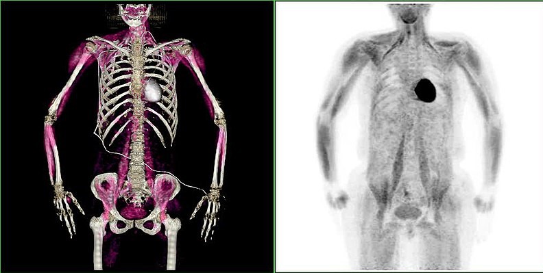 Die PET hat sich in der Krebsdiagnostik bewährt, weil sie – anders als die etablierten CT-, MRT- oder Ultraschall-Verfahren – Auskunft über die Stoffwechselaktivitäten eines Tumors geben kann. So lassen sich auch Metastasen und Tumorrückbildungen (Remissionen) nach einer Therapie nachweisen.19) In den modernsten Geräten wird PET mit CT oder MRT zu einem Hybridverfahren mit höherer Bildauflösung kombiniert, sodass Tumorveränderungen früher erkannt werden können.20)-23) Selbst einzelne Leukämiezellen im Knochenmark von Patientinnen und Patienten können abgebildet werden.24)