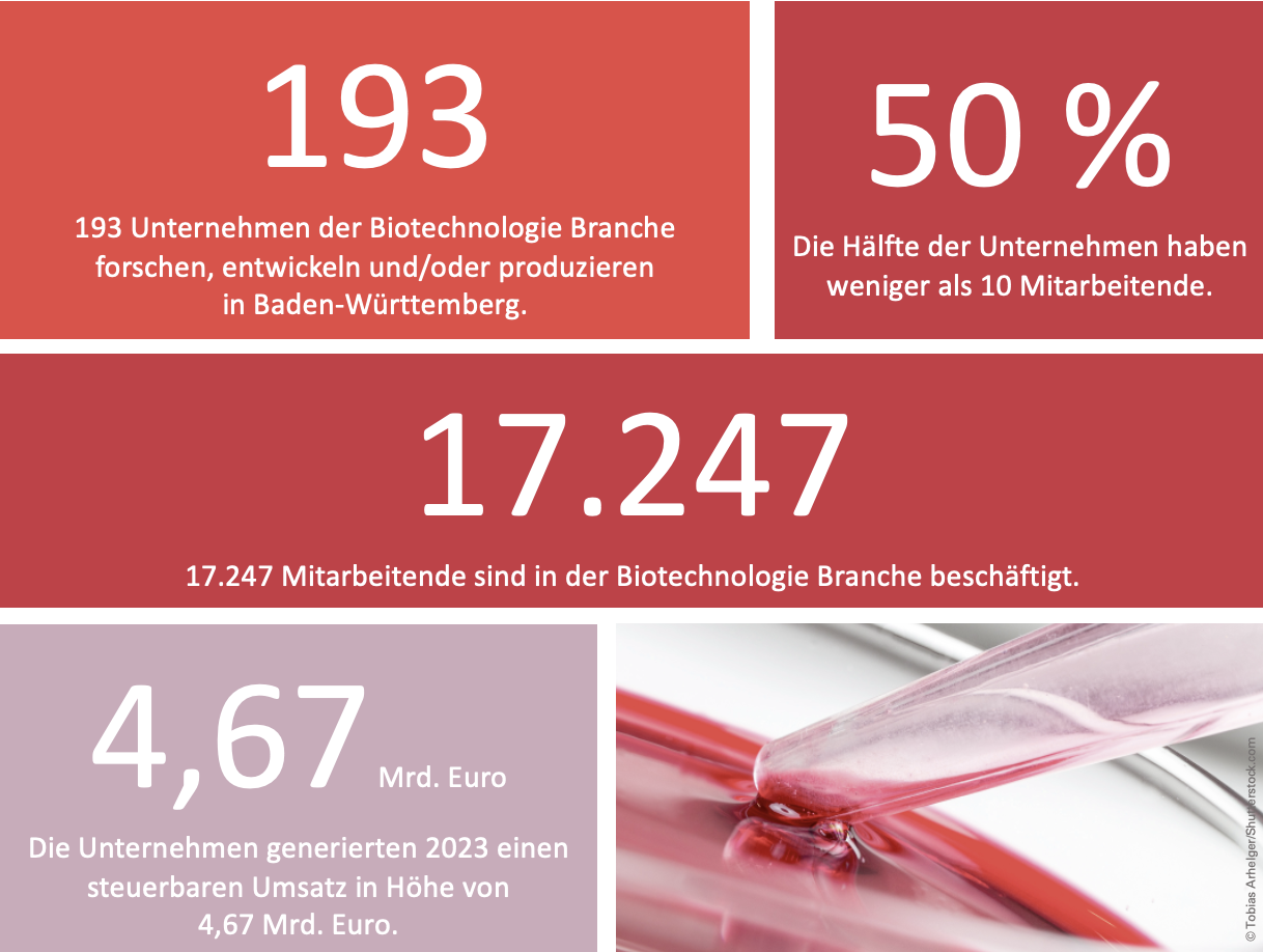 In Baden-Württemberg sind 193 Unternehmen im Bereich der medizinischen beziehungsweise roten Biotechnologie tätig, die am Standort forschen, entwickeln und/oder produzieren. Im Jahr 2023 erzielten diese Unternehmen einen Umsatz von 4,67 Milliarden Euro und beschäftigten insgesamt 17.247 Mitarbeiterinnen und Mitarbeiter. Die meisten Biotech-Unternehmen sind in den Regionen Mannheim/Heidelberg (65 Unternehmen), Freiburg/Offenburg/Lörrach (44 Unternehmen) sowie Reutlingen/Tübingen (30 Unternehmen) angesiedelt. Die umsatzstärksten Regionen sind jedoch Donau-Iller (Laupheim/Ulm/Biberach) und Rhein-Neckar (Heidelberg/Mannheim).
